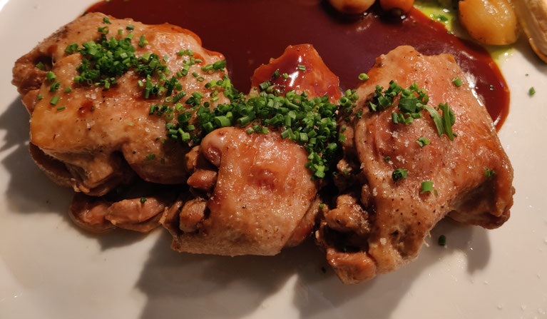 Saftig und knusprig gebackene Ente ohne Knochen mit eigener Soße aus dem Backofen.