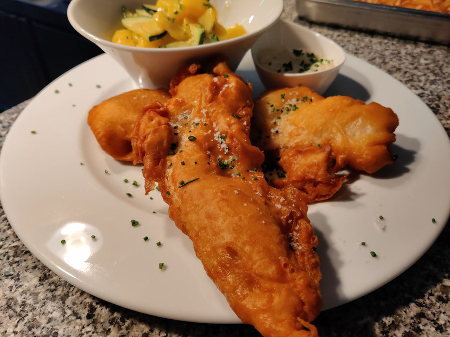 Homemade fried fish with remoulade sauce and a refreshing potato