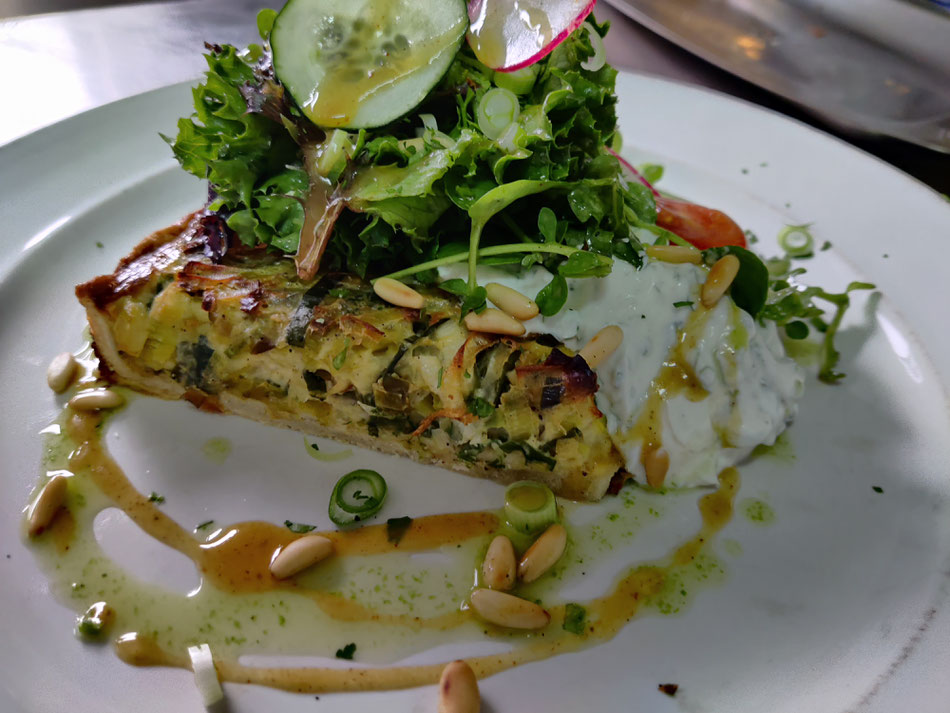 Vegetarian warm leek quiche with sunflower seeds, homemade herb curd and marinated leaf salad with balsamic dressing.