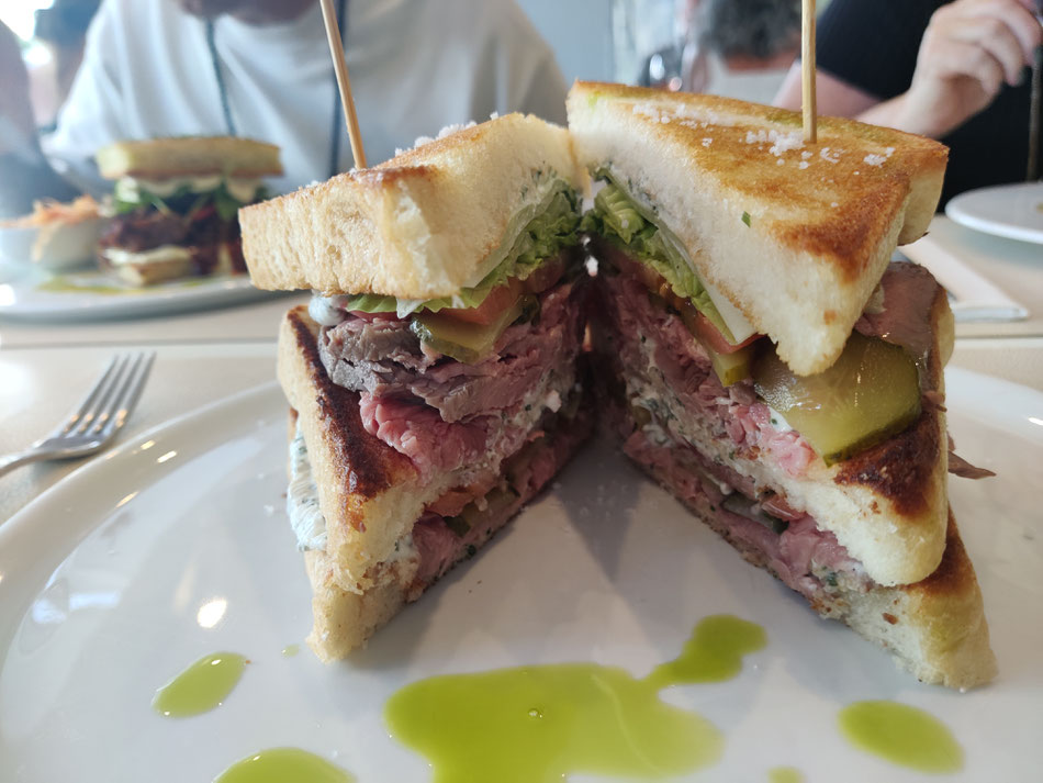 Club sandwich with toasted white bread filled with slow-cooked beef with tartar sauce, pickled cucumbers, large tomatoes, seasonal lettuce and pickled red onions.