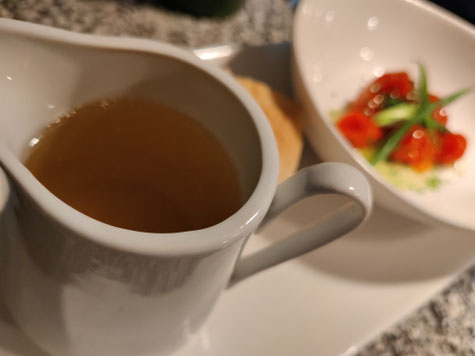 Tomato essence with juicy, pickled cherry tomatoes and freshly baked focaccia bread.