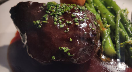 In de oven gestoofde, krokante en sappige runderwang met een eigen saus.