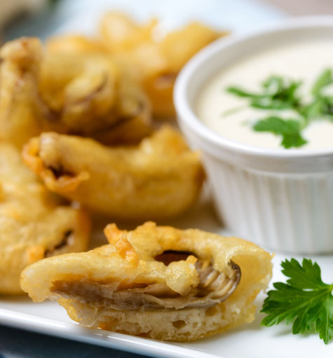 Sappige en knapperige gefrituurde oesterzwammen in tempurabeslag worden geserveerd met groene asperges en korrelige roomkaas.
