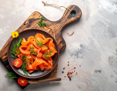 Huisgerookte zalm met een mierikswortelmousse omhuld met gelei. Deze fantastische creatie van chef-kok René wordt geserveerd met huisgemaakte mosterdpickles en ambachtelijk knäckebröd.