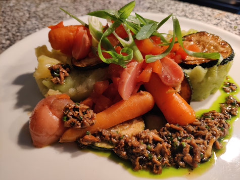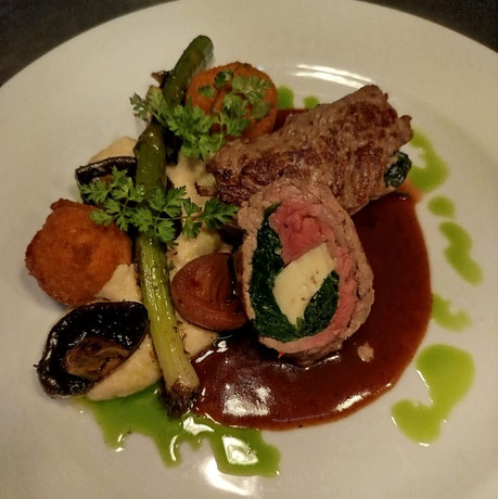 Involtini suculentos de carne local salteados, rellenos de espinacas frescas y queso portugués. Esta combinación gourmet se sirve con jugo de mora y calabaza Hokkaido estofada, además de puré de calabaza y un puro de patata asada.