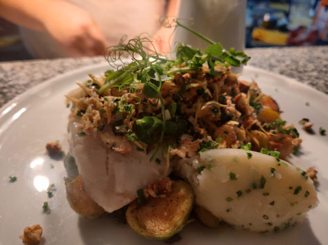 Esta nueva versión de la bullabesa, al estilo Kulinarium, se sirve con un caldo cremoso casero de crustáceos y pescado. Se refina con filetes de bacalao, salmón y lubina (robalo), además de mejillones, gambas y una gamba frita en rebozado kataifi. Esta sensacional variante de pescado se acompaña de verduras frescas como zanahorias, apio, habas, tirabeques y algas Paspier. Acompaña este plato con una elegante