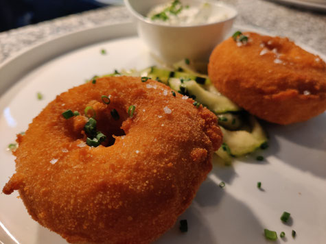 Rosquilla de bacalao crujiente y frita con salsa de hierbas frescas del Algarve. Este popular aperitivo se sirve con una crujiente ensalada de pepino y rábano.