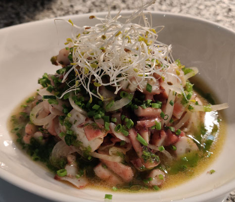 Ensalada de pulpo elegante, jugosa y suave, con un aderezo casero de limón y miel. Esta especialidad atlántica y regional se sirve con limones del Algarve, cebollas jugosas y perejil crujiente con ajo.