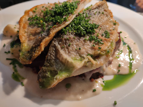 Filete de salmão suculento frito na frigideira com cobertura crocante e molho yuzu. Esta especialidade de peixe é servida com alho francês salteado, puré de ervilhas e palitos de maccaire de ervas e batata artesanal.