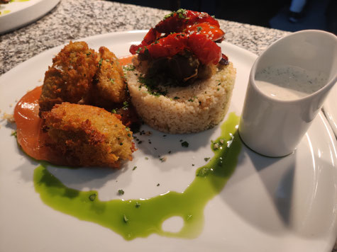 Falafel caseiro com molho de iogurte e menta delicadamente temperado e romã, com beringela e pimentos salteados e cuscuz de ervas com limão e salsa.